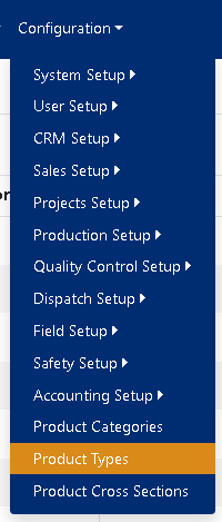 To access the Product Types screen, use the Configuration tab on the main menu at the top of the screen, then click on Product Types (see Figure 1).