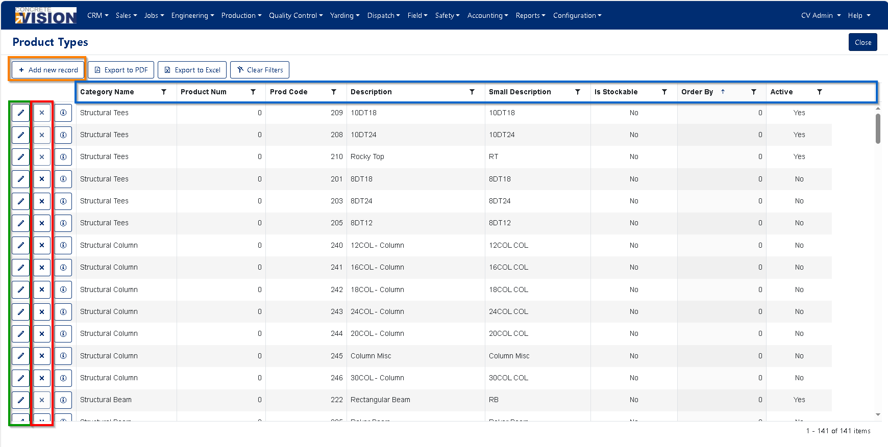 The Product Types management tool is used to define products and assign its Product Category (see Refer 1 below), Production Phase product code, and the products measurement Unit Type (see Refer 2) along with all its specifications. While these values are used throughout Concrete Vision, they are particularly important for defining Production Cross Sections (see Refer 3). When using the Production Bed Setups (see Refer 4) management tool, these Production Cross Sections allow defining which product can be produced on which Production Bed.