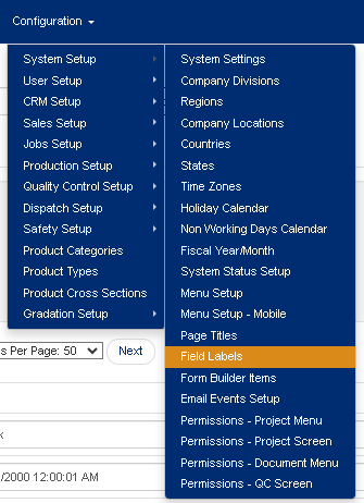To access the Field Labels screen, use the Configuration tab on the main menu at the top of the screen, then click on the sub-menu System Setup followed by clicking Field Labels (see Figure 1 below).