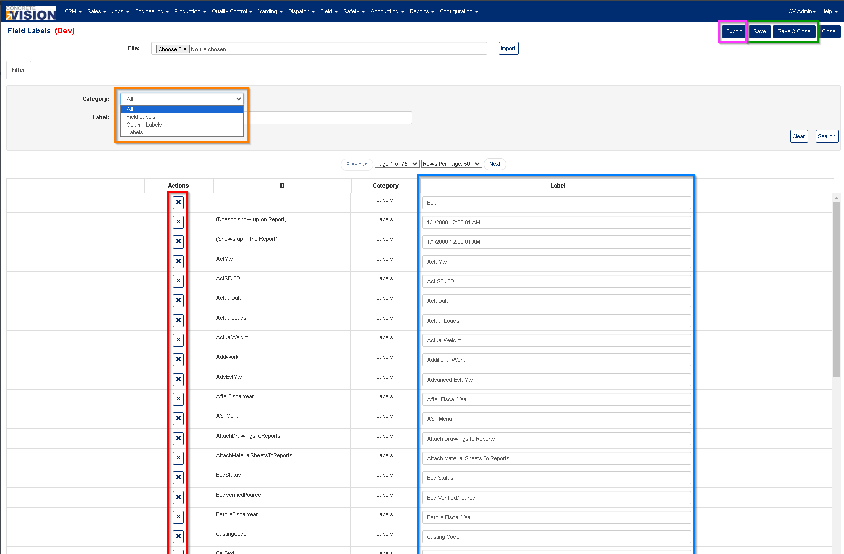 - Click on the Export button located near the top right of the screen (see Figure 2 pink) to export all Field Labels to a excel spreadsheet.