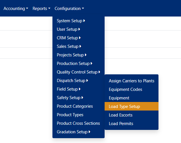 To access the Load Type Setup screen, use the Configuration tab on the main menu at the top of the screen, then click on Dispatch Setup > Load Type Setup (see Figure 1).