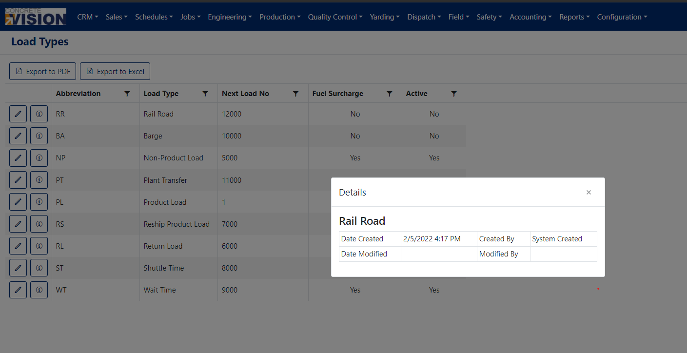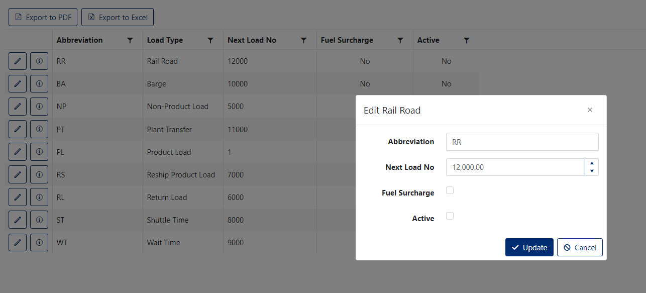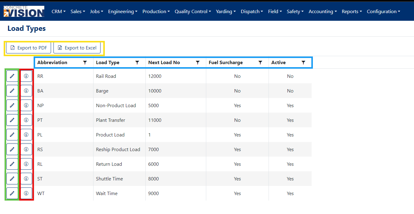 The Load Type Setup screen allows you to view, modify and export Load Types (see Figure 2)