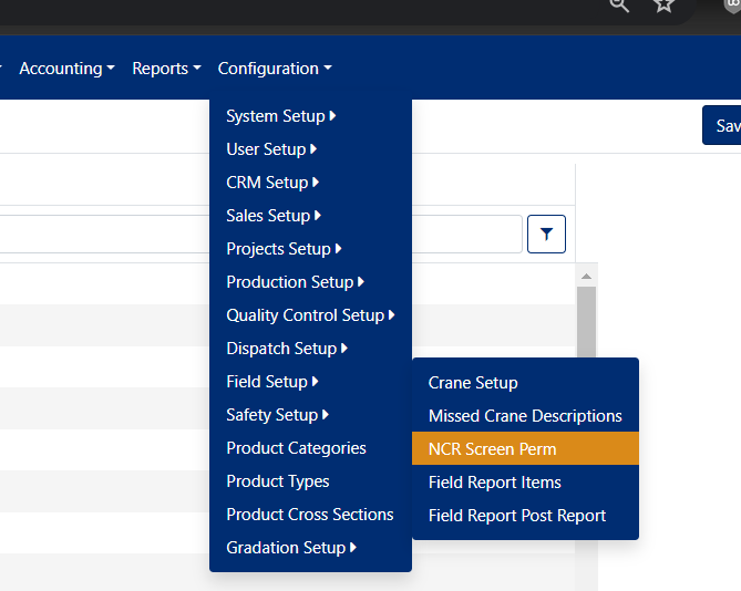 You access the NCR Screen Perm via Configuration > Field Setup > NCR Screen Perm, as shown below in Figure 1.