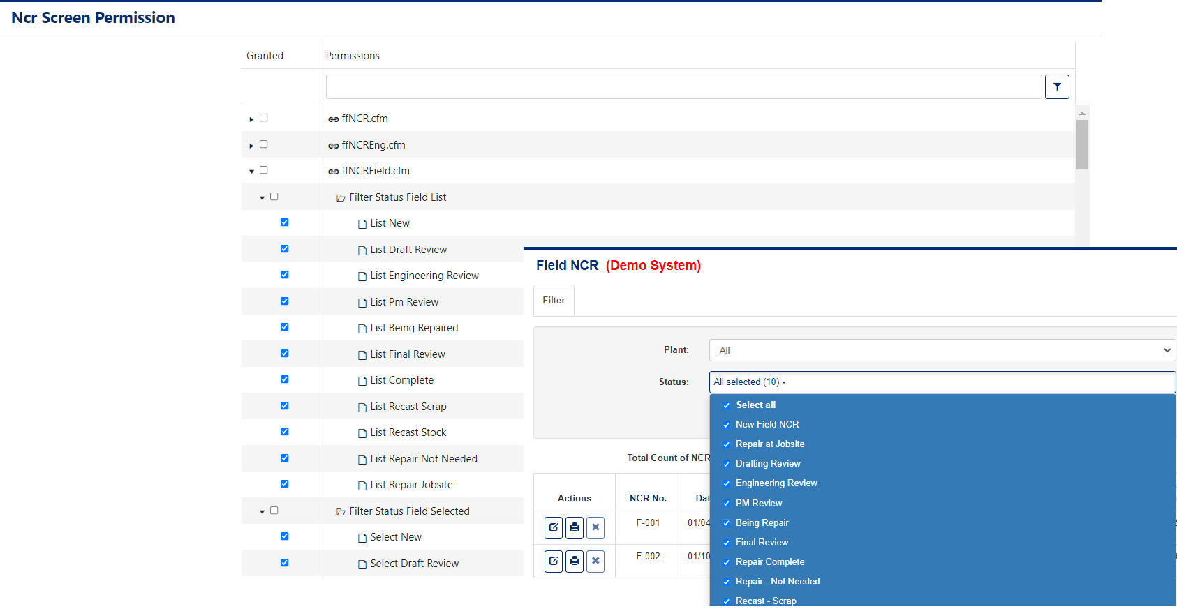 The NCR Screen Perm setup screen shown in Figure 2, lists the various NCR screens available. Each "Filename" is a different screen within the system, with distinct permissions. The "ffNCR.cfm" file for example contains the permissions for the "Field NCR" screen (Field > Field NCRs).
