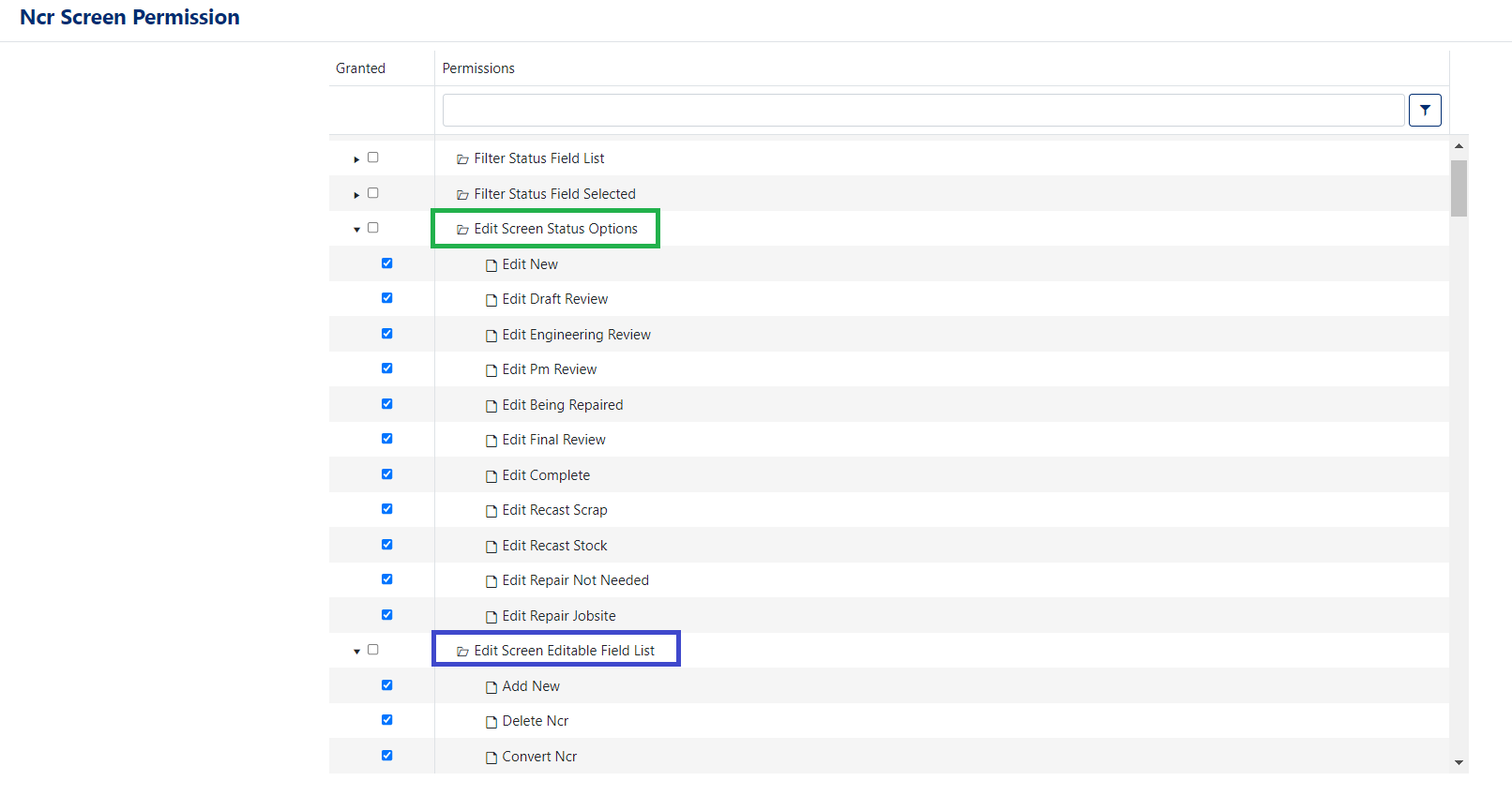 - The Third Permissions group, which is the "Edit Screen Status Options" (Green box in Figure 4), allows you to specify what statuses the user has access to for a particular NCR screen. You can see those statuses in the dropdown (NCR status), Yellow box in Figure 5.