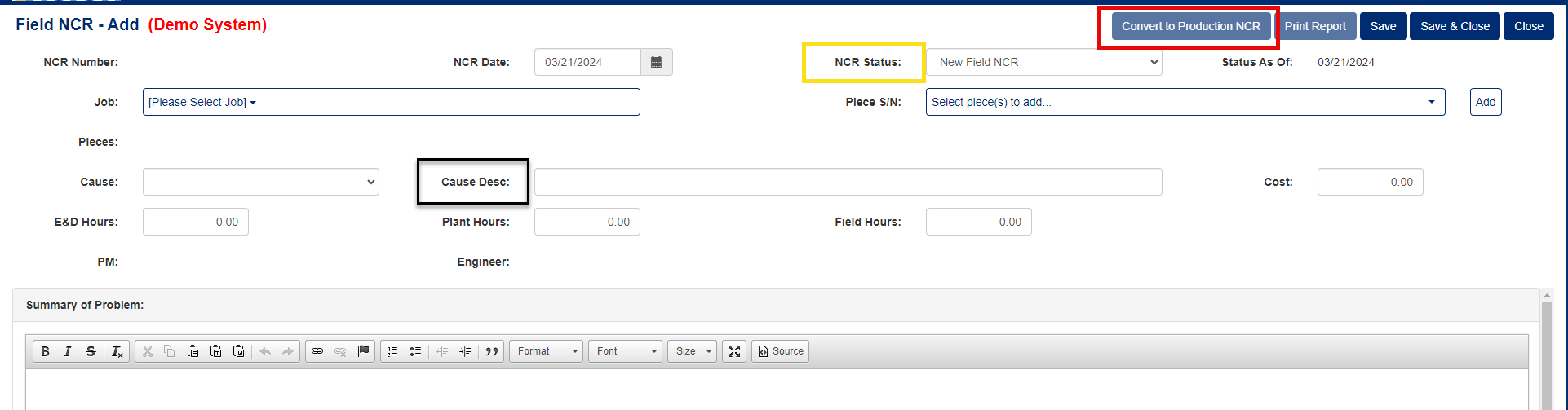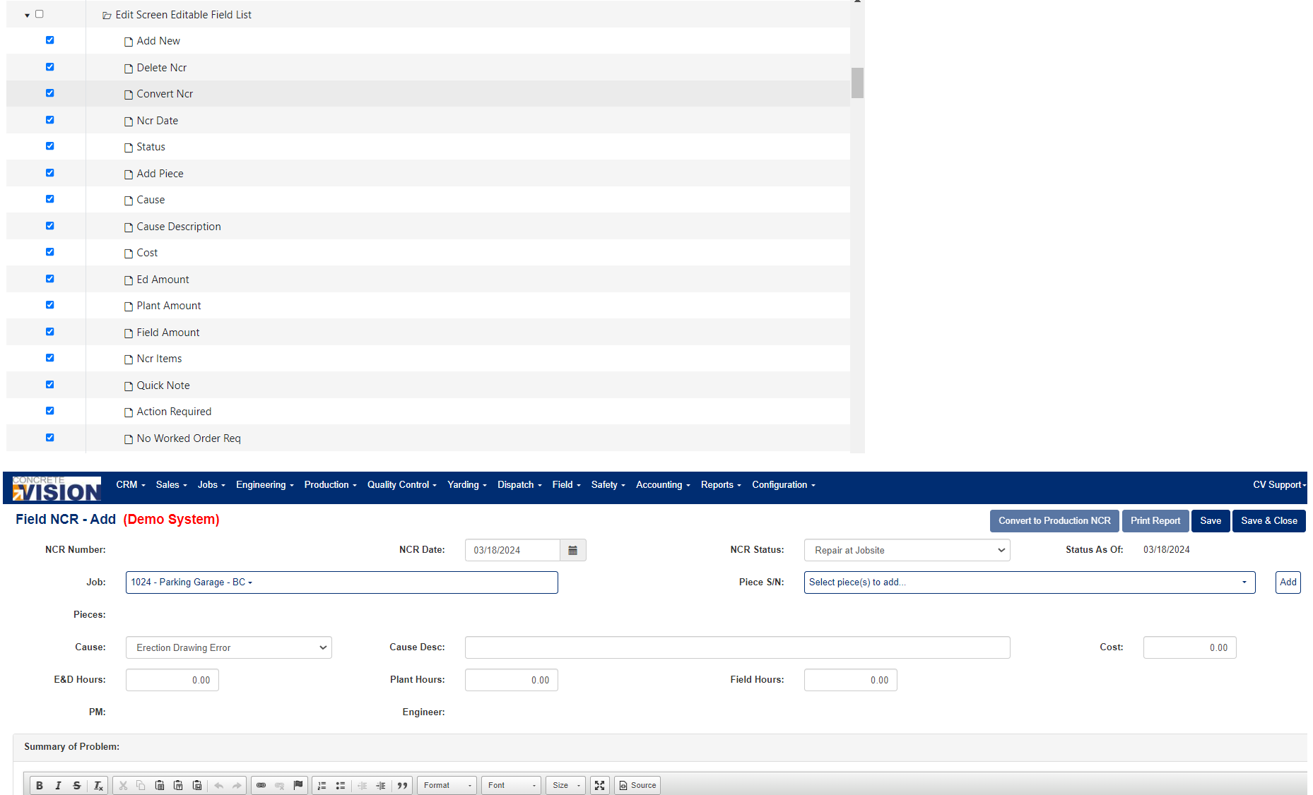 - The Fourth Permissions group which is the "Edit Screen Editable Field List" (Blue box in Figure 4), allows you to specify which fields are editable to the user, such as the "Cause Description"(Black box in Figure 5), or which actions the user is allowed to perform, such as "Convert to Production NCR" (Red box in Figure 5), on the add/edit screen. See Figure 6.