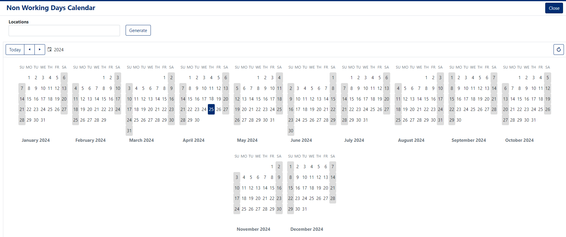 Once there, you will notice calendar (see Figure 2). There is a Locations dropdown where you can filter for Non Working Days specific to a plant or form. There are also toggle arrows that let change the year of the calendar you are viewing.