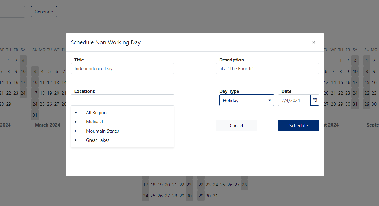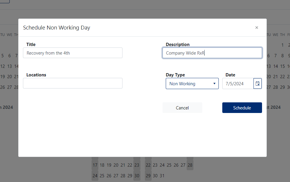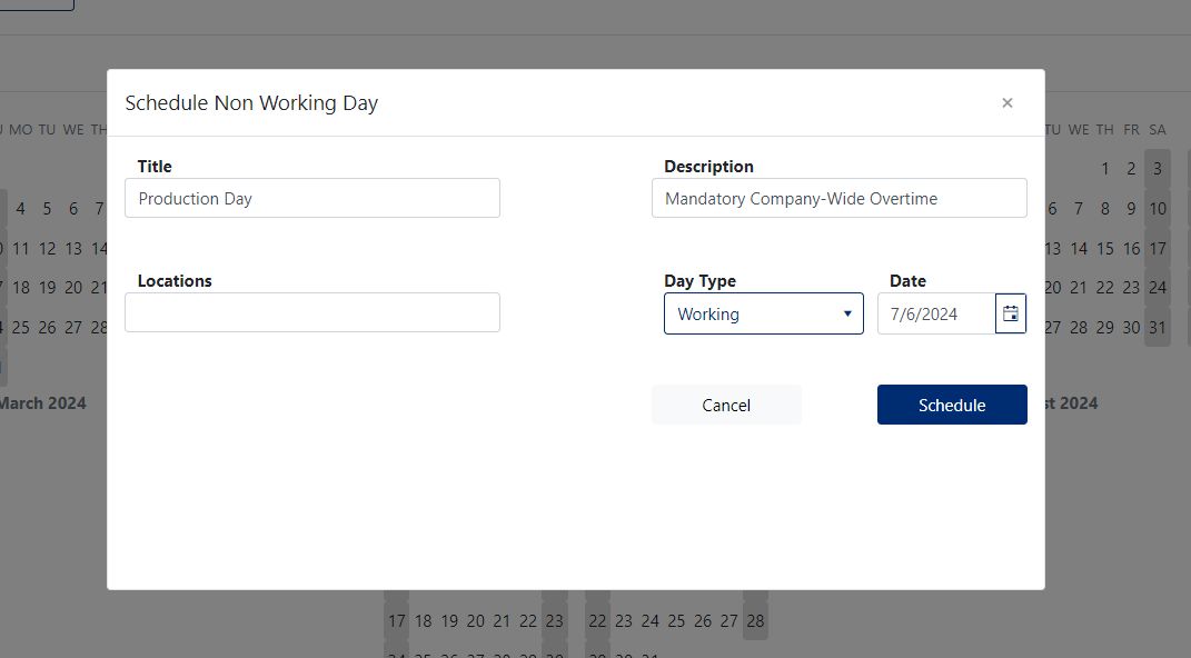 - You can select the Day Type (Non Working Day, Working Day or Holiday) It defaults to Holiday.