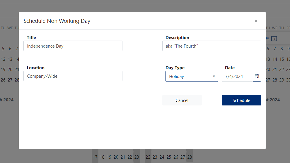 - Enter the Title of the Holiday (Independence Day), a short description if desired.