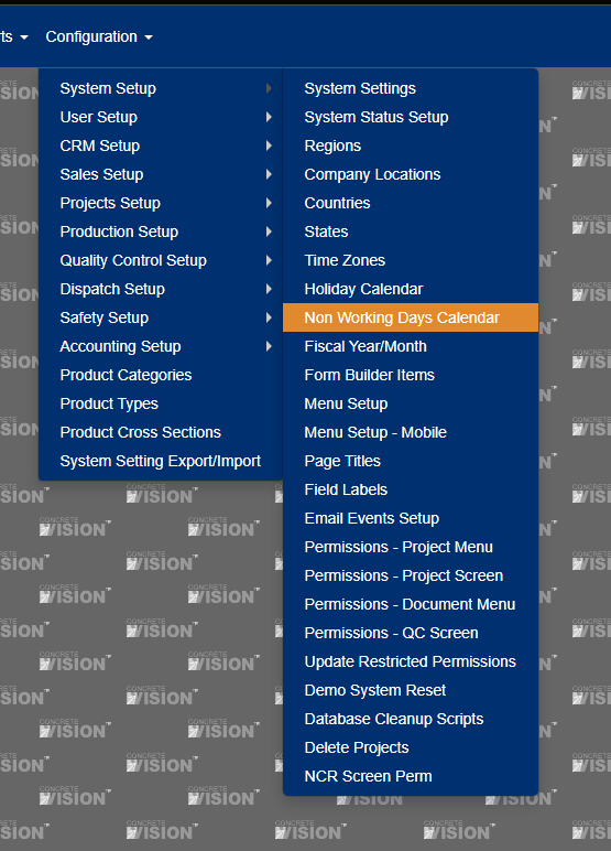 You access Non Working Days screen via Configuration menu > System Setup > Non Working Days, shown in Figure 1 below.