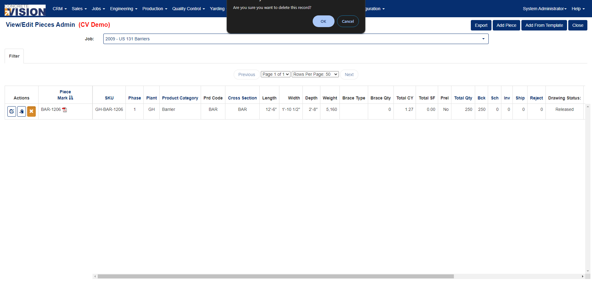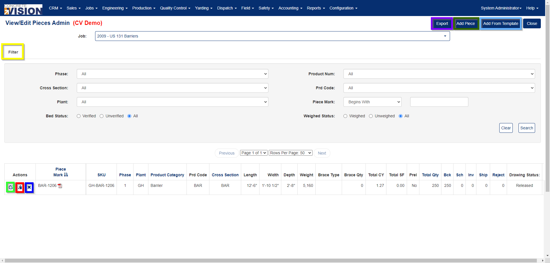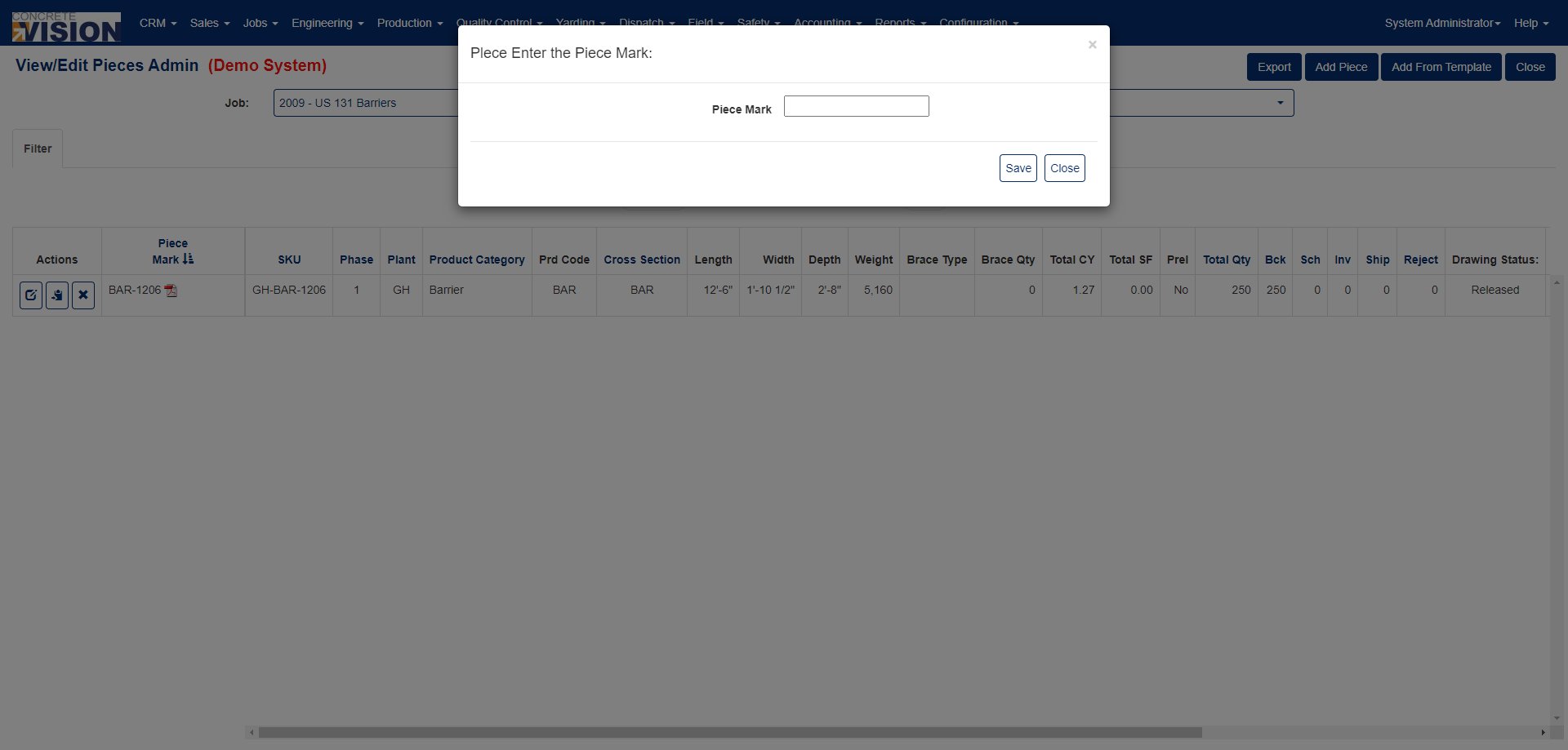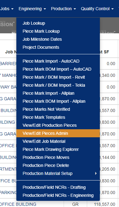You can access View/Edit Pieces Admin screen from the Engineering menu > View/Edit Pieces Admin. (See Figure 1 below).