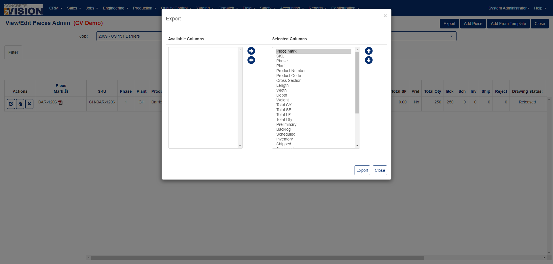- An Export modal opens with Available & Selected columns