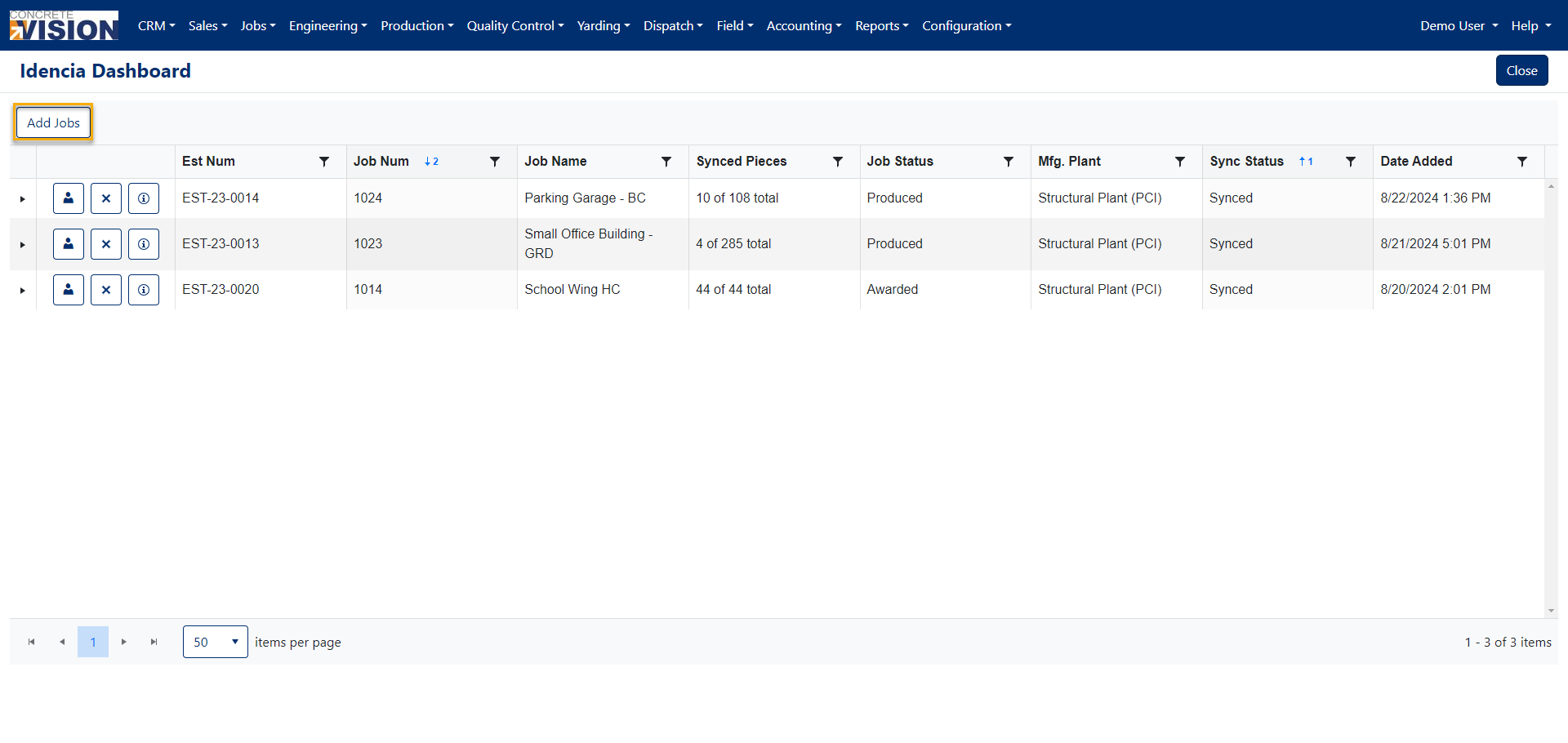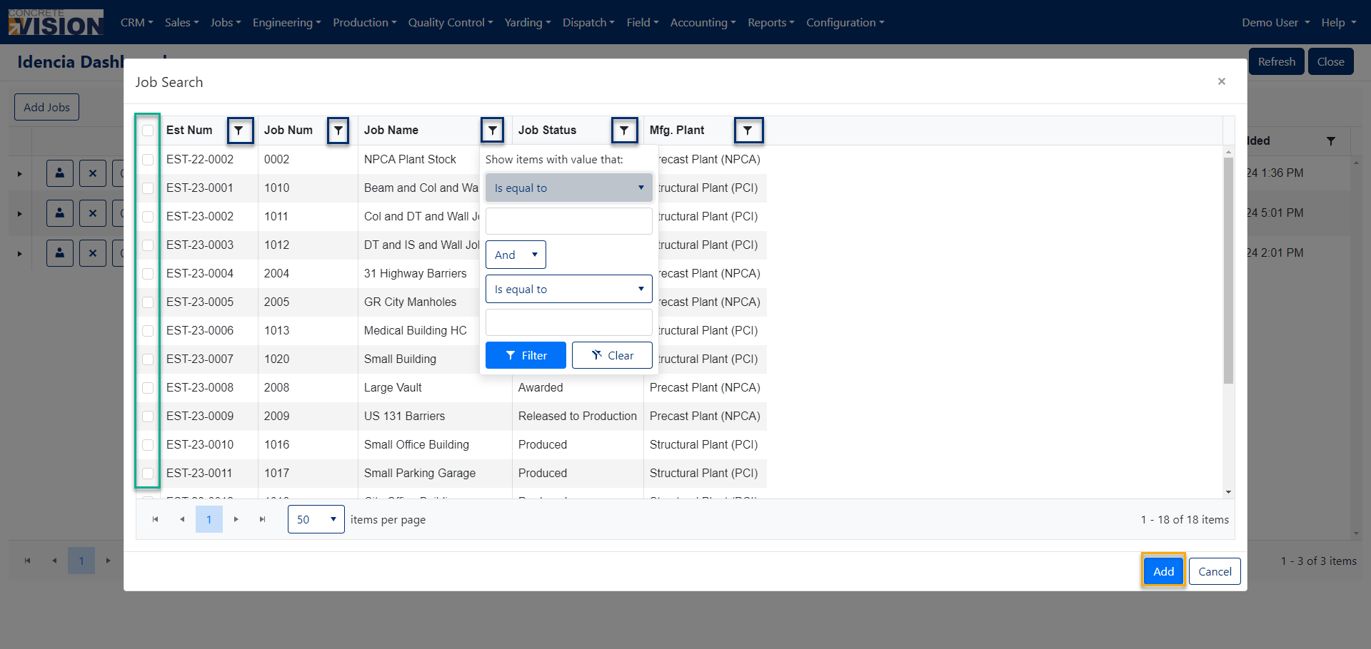- Click the Add button (Figure 3 orange outline) at the bottom of the Job Search window to queue the project(s) to sync to Idencia.