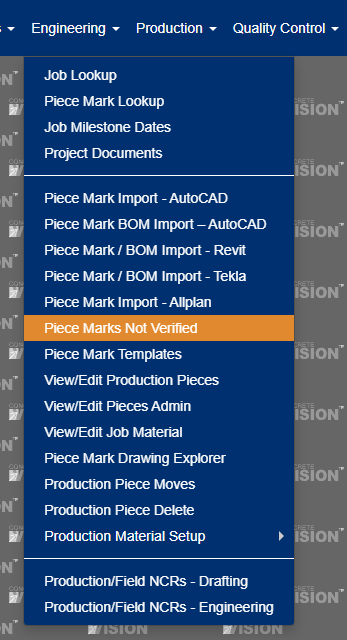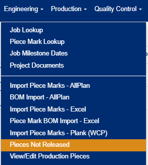 The Pieces not Released screen (also called Piece Marks not Verified on some systems) allows you to verify and move piece marks that were imported via Excel template import from engineering to production. This is a critical step in the workflow to ensure imported piece data is accurate before it becomes part of active production.