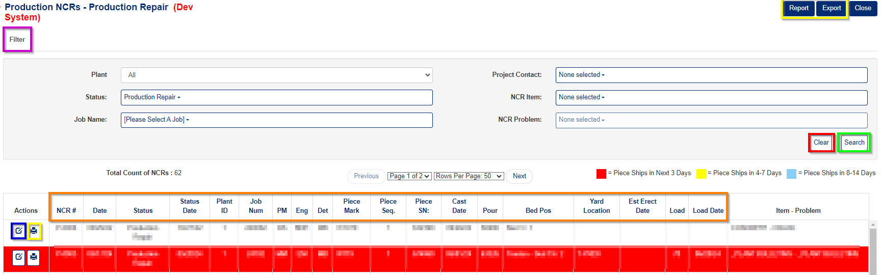- Click the Print icon next to the specific NCR you want to print (Yellow box in detail section of Figure 2)