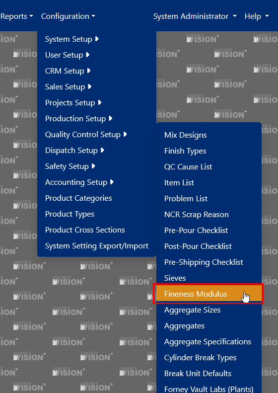 The Fineness Modulus is a critical parameter used in concrete quality control to evaluate the particle size distribution of fine aggregates (sand). This configuration allows you to set up specifications that determine whether a fine aggregate's fineness modulus meets your project requirements.