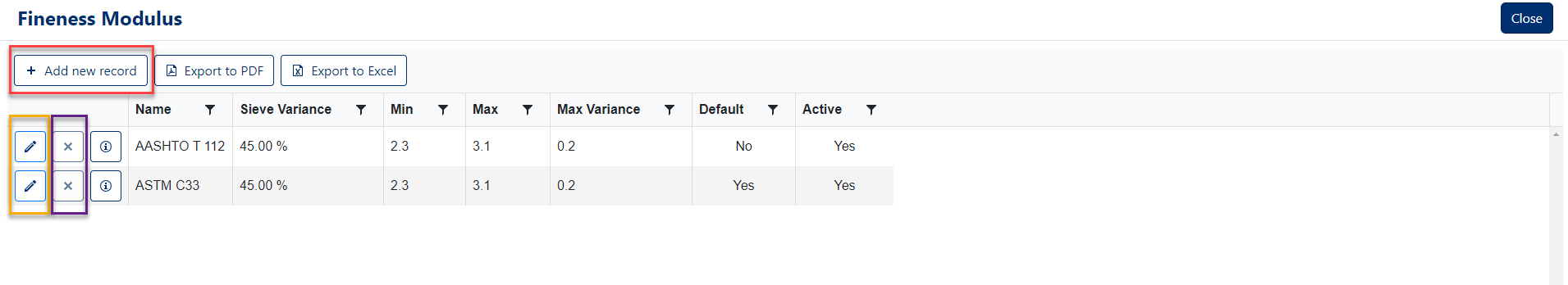 ⚠️ Important Limitation: You cannot delete Fineness Modulus specifications that have been used in aggregate tests.