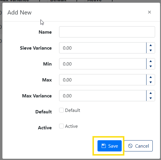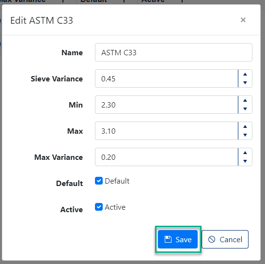 - Name: Enter a clear, descriptive name (e.g., "ASTM C33 Standard")