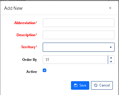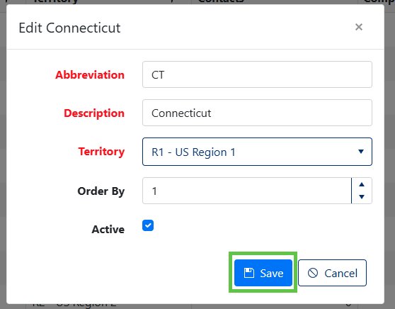 Field Requirements Description Abbreviation Required, max 25 characters Short code for the region (e.g., "NE", "SW", "CA") Description Required, max 50 characters Full descriptive name (e.g., "Northeast Region") Territory Required selection Parent territory for this region Configure Optional Settings