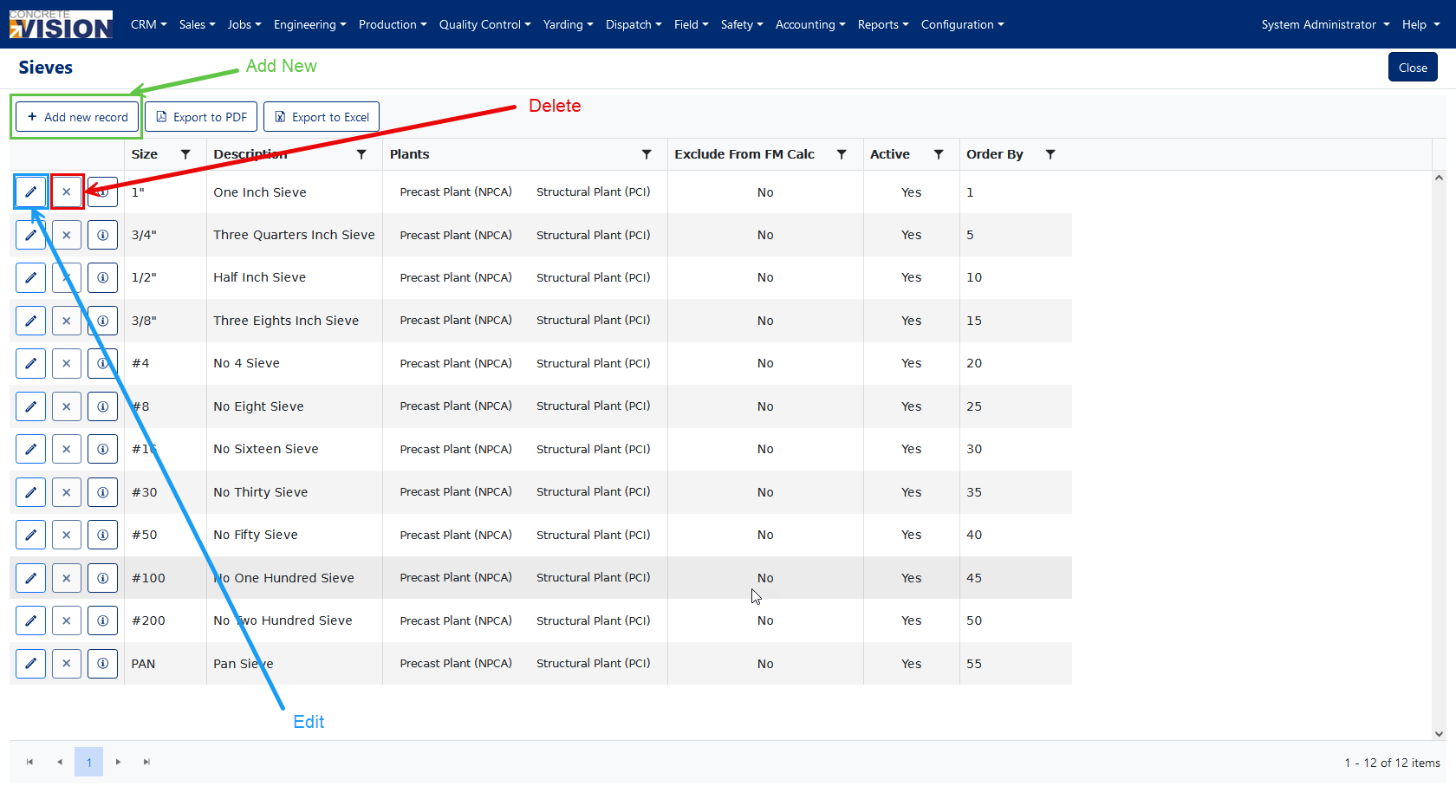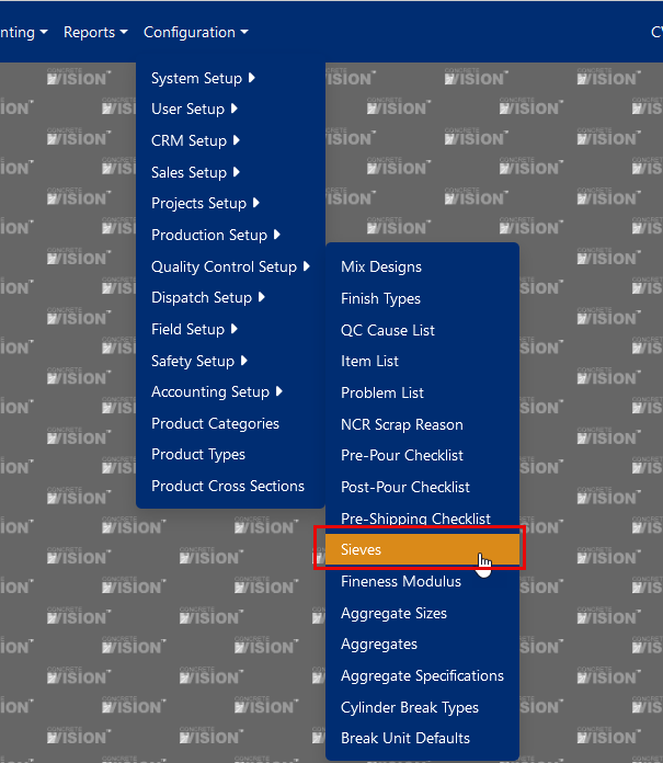 Navigate to: Configuration menu > Quality Control Setup > Sieves