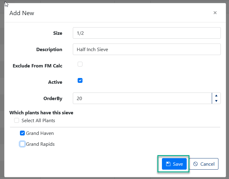 | Size | The maximum size of aggregate that can exit the sieve (10 characters max) Required |