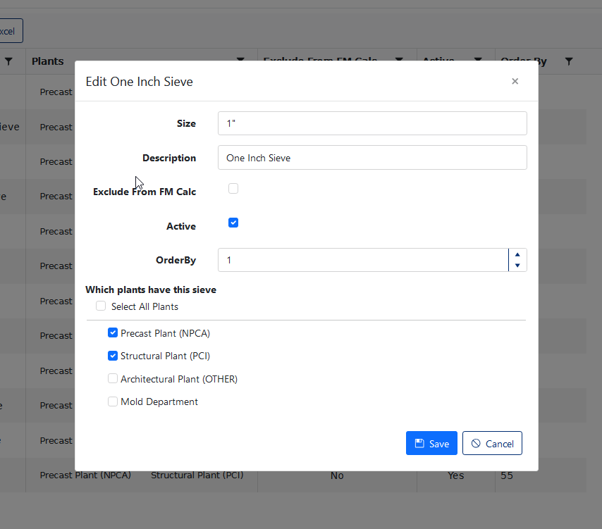 | Active | When checked (yes), the sieve will be used in determining if an aggregate passes a test |