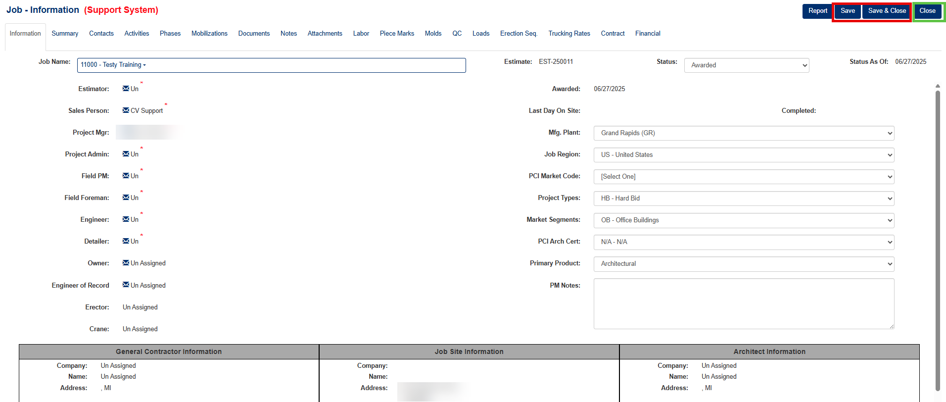 - Key Dates: Awarded Date, Contract Date, Substantial Complete