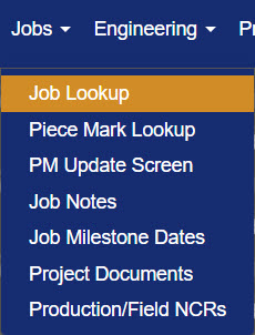 NOTE: Job Lookup is also available through the Engineering, Production, Quality Control, Yarding, Dispatch, Fielding, Accounting, and Reports menu items.
