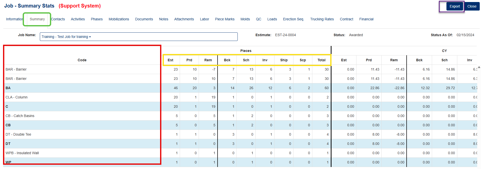 - CY: Cubic yards of pieces in the job.