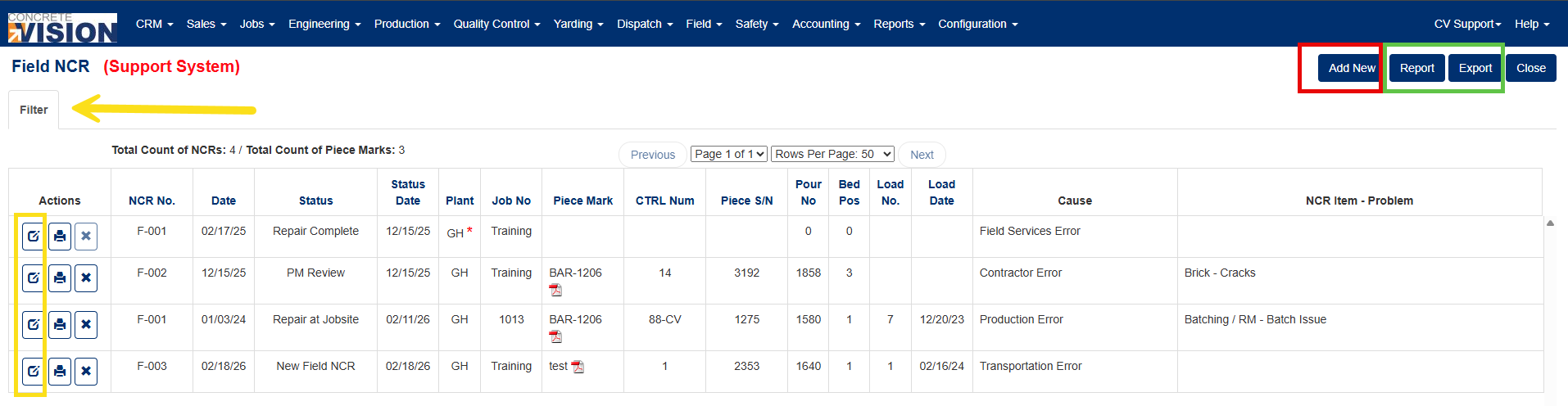 Use the Filter tab (yellow arrow, Figure 2) to locate specific Field NCRs: